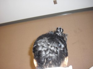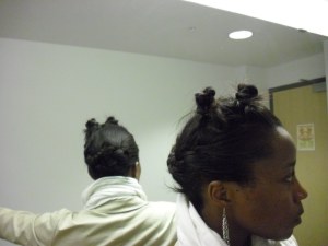 Here are some more pictures of the up-do I have pictured above. To get this style I parted out a section in the the front, enough to get about a handful of hair. This front section I split in half diagonally and then twisted each section and then twisted the twist around itself to make the know. I then used a bobby pin to secure the knot. Now it is possible to make these knots tidy but I like the messy look and so I let the ends stick out. Then with the hair that was left at the back, using my finger, I split it diagonally from one end to the other and then I plaited French braids following the diagonal and then using bobby pins, secured the braids into each other. Again I let the ends hang out and messy-up the style a little bit. This look can be done with natural and relaxed hair. However, with natural hair, I might go for a cleaner, less messy look. More pictures of the final product: