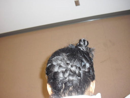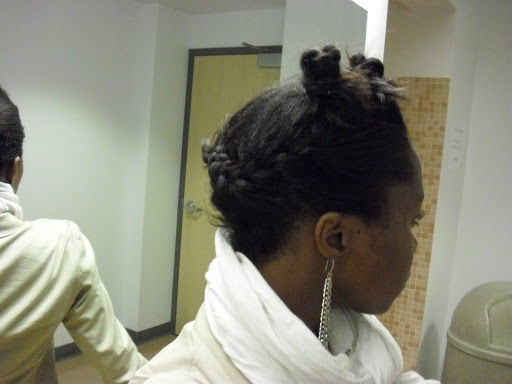 Here are some more pictures of the up-do I have pictured above. To get this style I parted out a section in the the front, enough to get about a handful of hair. This front section I split in half diagonally and then twisted each section and then twisted the twist around itself to make the know. I then used a bobby pin to secure the knot. Now it is possible to make these knots tidy but I like the messy look and so I let the ends stick out. Then with the hair that was left at the back, using my finger, I split it diagonally from one end to the other and then I plaited French braids following the diagonal and then using bobby pins, secured the braids into each other. Again I let the ends hang out and messy-up the style a little bit. This look can be done with natural and relaxed hair. However, with natural hair, I might go for a cleaner, less messy look. More pictures of the final product: