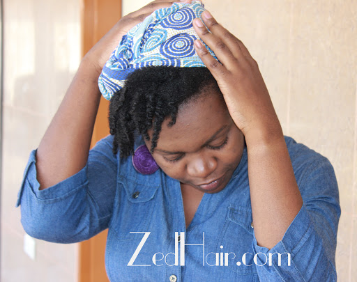 1. The night before my twist out, I sprayed my moisturising spritz (water, aloe vera juice, natural oil), oiled the ends and then covered it with a satin scarf and slept. 2. In the morning, I put a few drops of oil on my hands before undoing the twists, starting from the ends. 3. I tied the back of my hair in a loose ponytail. This was so I wouldn’t have a big bump from a high and tight ponytail. 4. Then I wore a satin scarf over the part of my head that would be covered with a cotton scarf. This was to protect my hair from the drying effects of the cotton. 5. I tied the scarf using the turban method in this video from Naptural85: