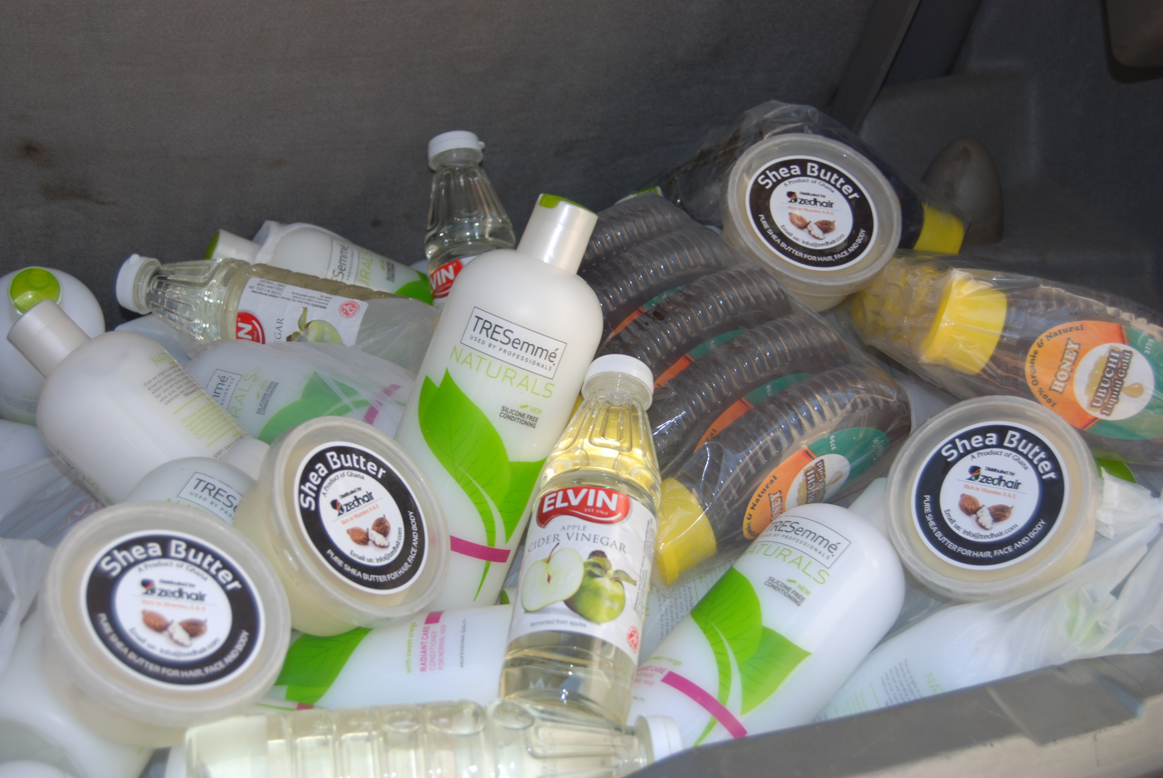 A trunk full of products for the girls, including ZedHair Shea Butter, Apple Cider Vinegar, Ubuchi Honey and TRESemme Naturals.