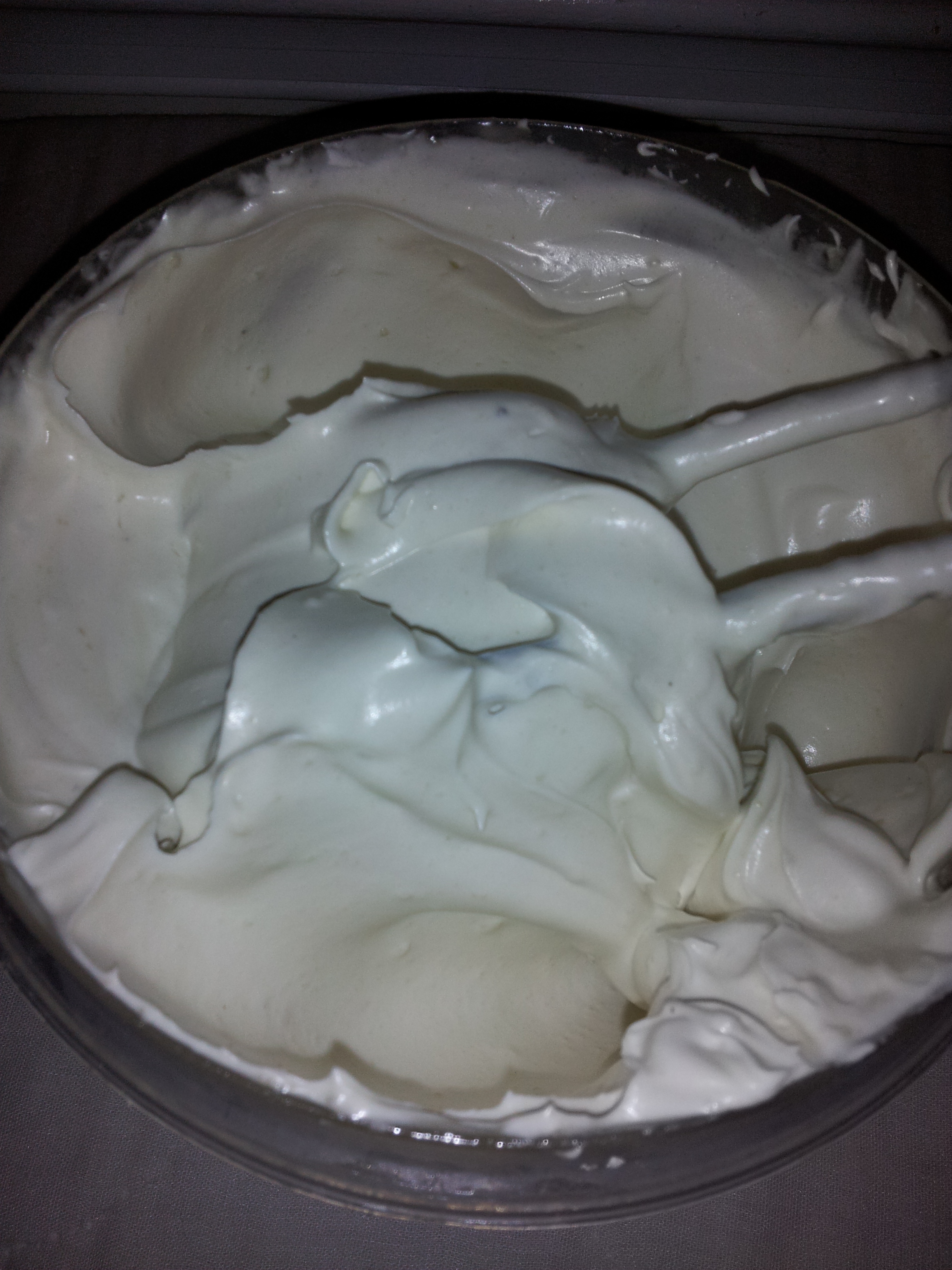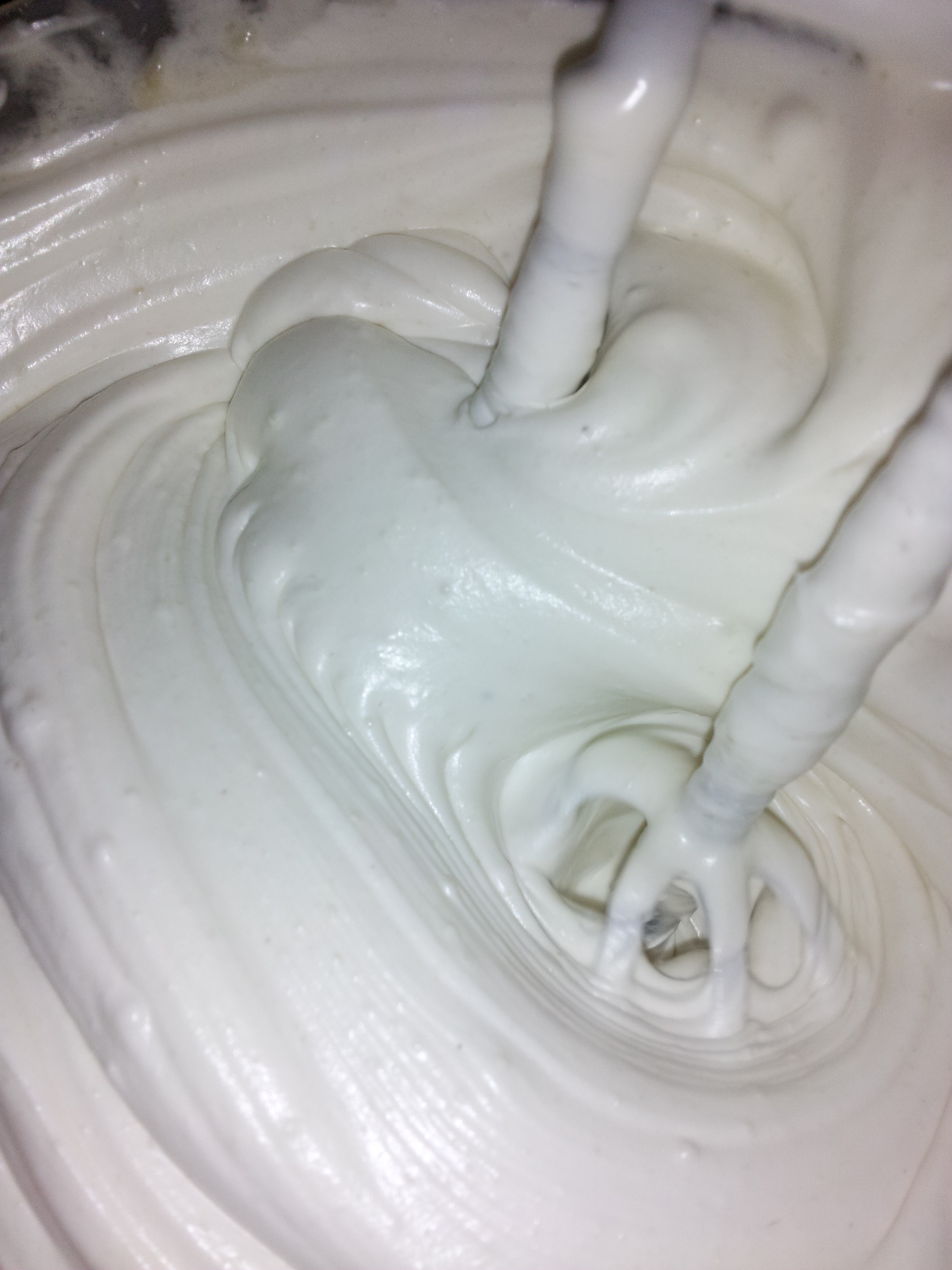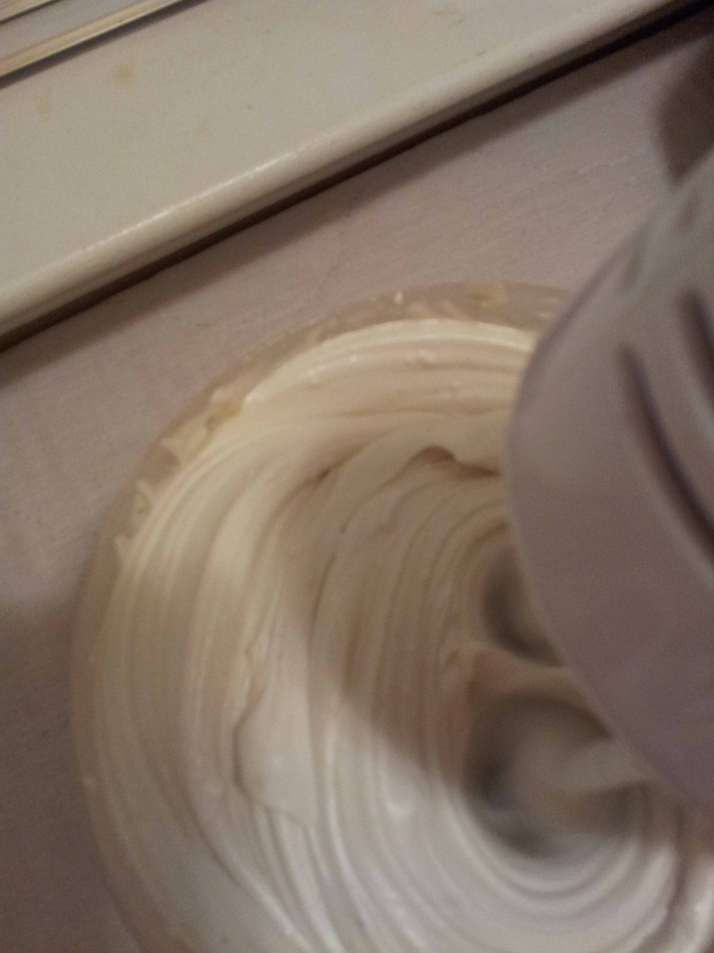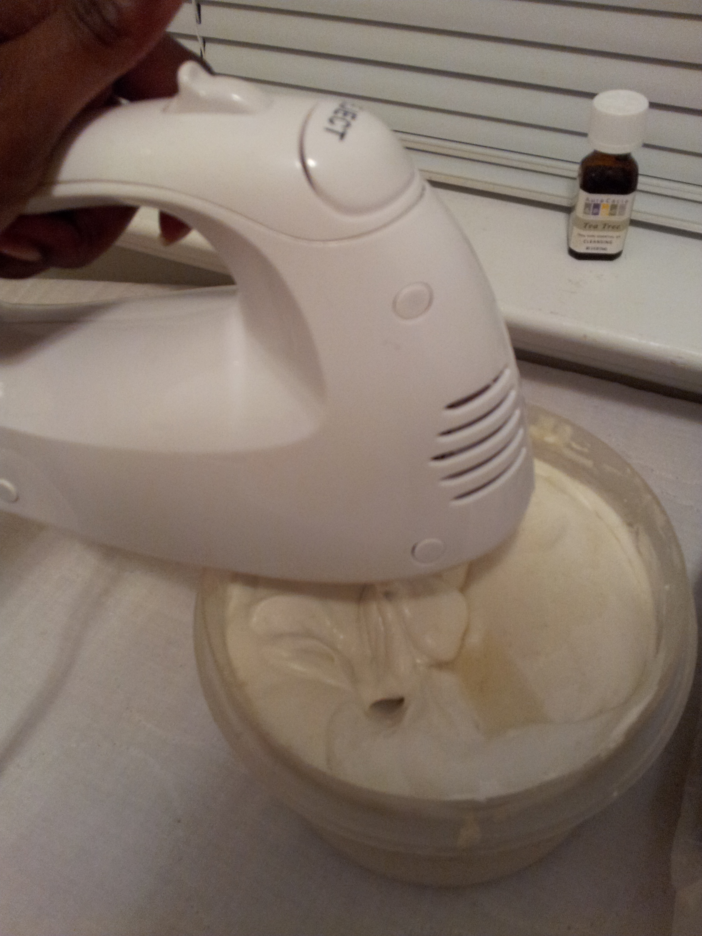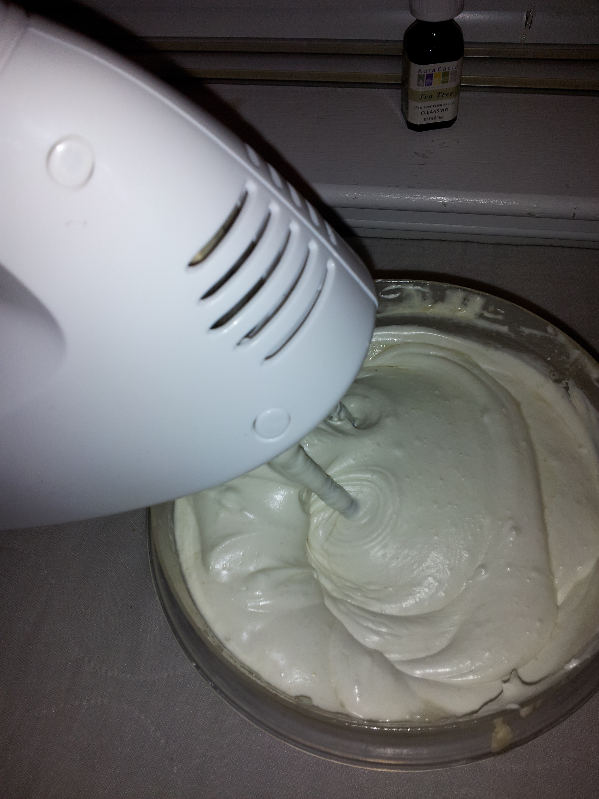 The last 10 minutes of mixing and prepping my shea butter souffle, as captured on my phone’s camera.